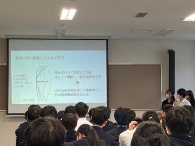 12月11日(日)「石川県中学・高校生徒物理研究発表会」がオンラインで開催され、本校からは3つの班(「反射波の方向と強さの制御について」「お椀が動く現象について」「弓道における弦音の性質について」)が口頭発表を行いました。