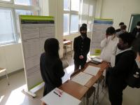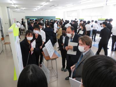 3月15日(水)5,6限目に、北陸先端科学技術大学院大学の先生方、大学院生(留学生)、他校のALTの先生方をお迎えして、理数科2年生が1年間取り組んだ課題研究を英語でポスター発表をしました。生徒は、聴衆のみなさんの顔を見て反応を確認しながら堂々と発表し、質問に対してもしっかりと答えることができており、さらに有意義なアドバイスを頂くことができました。6限目からは理数科1年生も参加し、熱心に質疑応答に参加していました。