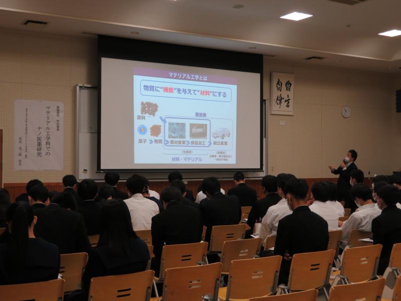 4月17日(月)、理数科2年、3年を対象に特別講義が行われました。東京大学工学部マテリアル工学科から宮田完二郎教授をお招きし、「マテリアル工学科でのナノ医薬研究」という演題でご講演をいただきました。