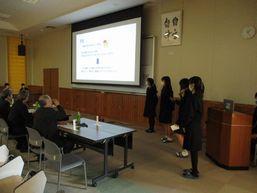 事前に、9月28日(月)に第1回(自己紹介と学校紹介)、10月28日(水)に第2回(発表班による研究の概要説明、お互いの文化に対する質問)を行ってきましたが、第3回の最終回では、両校の校長先生の挨拶の後、共同研究班の発表(ティーリーフパラドックスの発展的研究、グリシンを用いてヒスタミンを減少させる研究)、28Hの研究2班の発表(結露量の物理的手法を用いた測定と防止法の研究、天然素材を使った接着剤の研究)が行われ、それぞれの研究に対して活発な意見交換や、質疑応答がありました。また、両国の文化をより深く理解するために、日本の俳句に関する文化紹介発表と、韓国の若者の文化紹介、ハングルに関する発表が行われました。