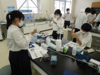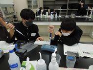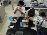 石川県立大学では、中谷内先生のご指導のもと、「河川に存在するDNAの分析」という内容で、河川水に含まれる外来魚DNAをリアルタイムPCRで増幅させ、電気泳動で分析しました。生徒たちはバイオテクノロジーの一端に触れ、遺伝子を扱う細かい作業を班で協力しあいながら熱心に取り組んでいました。