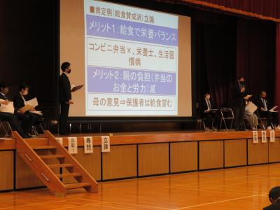 次に、証拠を使って論理的に立証することを具体的にイメージしてもらうために、学年団の先生方によるモデルディベート「高校でも給食を導入すべきである。」が行われました。