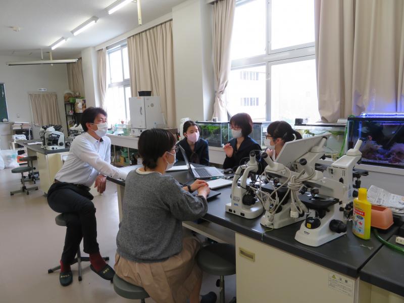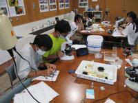 午後は午前に採集したウニを人工受精させ、発生の様子を顕微鏡で観察しました。また、発生観察の合間に採取したウニやヒトデ、海藻などの海洋生物の観察・同定およびスケッチを行いました。ウニの人工受精は多くの班が成功し、生徒たちはとても充実した様子でした。