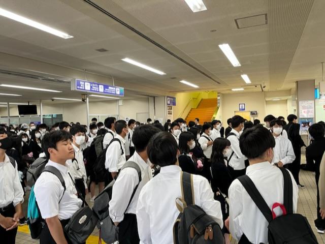 12時40分に地震発生の放送。生徒・職員は机の下にもぐり身を守る行動。地震の揺れは約1分間。その後火災報知器が作動し、火災の確認、火災発生の放送で生徒玄関先に避難開始しました。