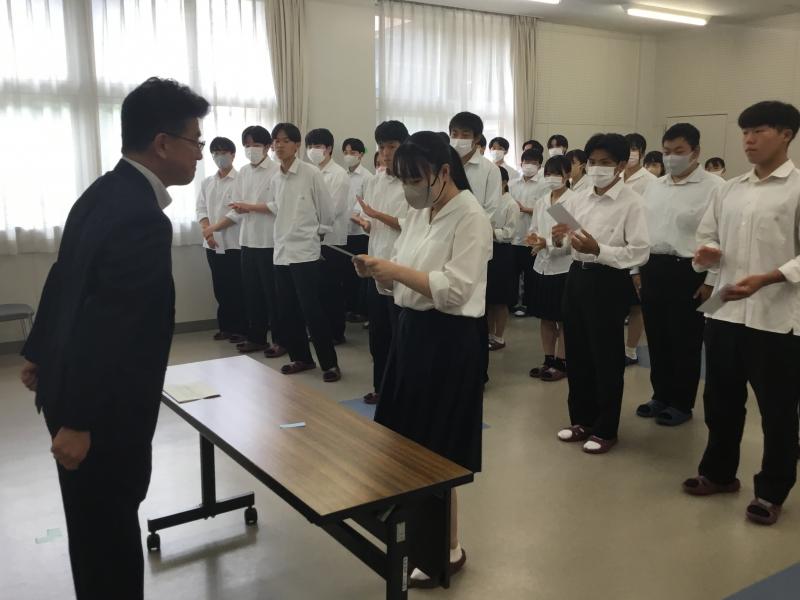 「第74回中部日本卓球選手権大会」に出場する卓球部の皆さんに7月14日(木)の昼休みに校長先生から激励のことばがあり、激励金が渡されました。各選手の健闘をお祈りいたします。