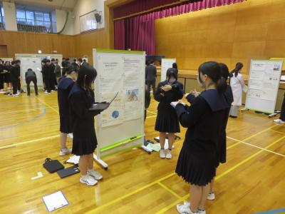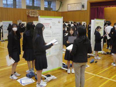 1月11日(金)本校体育館にて、2年普通科の生徒による「課題研究ポスター発表会」が行われ、自分たちが設定したテーマに関して1年間の研究成果を発表しました。今年は初めて文系と理系の合同開催となり、生徒は興味のあるテーマのポスターを訪れて、熱心に耳を傾けていました。また、発表に続く質疑応答では、発表者と聞き手の非常な活発なやりとりが行われました。講評者として参加して下さった大学の先生方から専門的な観点からの助言や講評を頂くこともできました。生徒からは、「聞き手の顔を見ながら説明できるように、手持ちの原稿を見ずに発表できるように頑張りました」「大学の先生方に説明するのはとても緊張した。アドバイスをいただいて、自分達の研究の不十分な点に気づくことができた」「規則性を考えるテーマだったが、調べきれなかった。研究は無限で終わりはないと感じた」などの声が聞かれました。