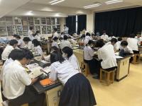 SSH4期目の探究活動の普及の一環として、7月11日(火)3,4限目に理数科2年生全員が、小松市立国府中学校を訪問し、第1回「高校生と究める探究教室」を行いました。生徒達は国府中学校1年生のみなさんと、一対一のペアになり、夏の理科の自由研究で、どのような分野でどのような方法で探究活動を進めていくとよいのかのアドバイスをさせてもらいました。自分たちが小松高校での課題研究を通して学んだことを、中学生に分かりやすく伝わるようにと工夫して話している様子が見られました。参加した生徒からは、「中学生の発想が素晴らしかったし、自分たちの方がとても勉強になりました」という声か聞かれました。