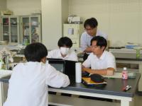 百瀬先生はガラス管と銅管をつなげたものの中に水を入れ、真空にすることで作成したヒートパイプに熱を加え、水が沸騰する様子を見せてくださいました。生徒達は、このヒートパイプが、地熱を利用し地下水をくみ上げるのに使われており、農作物や融雪装置に利用されていることを学びました。生徒からは、「単純な装置だが、有効利用されていることを知って驚いた。」という声が聞かれました。