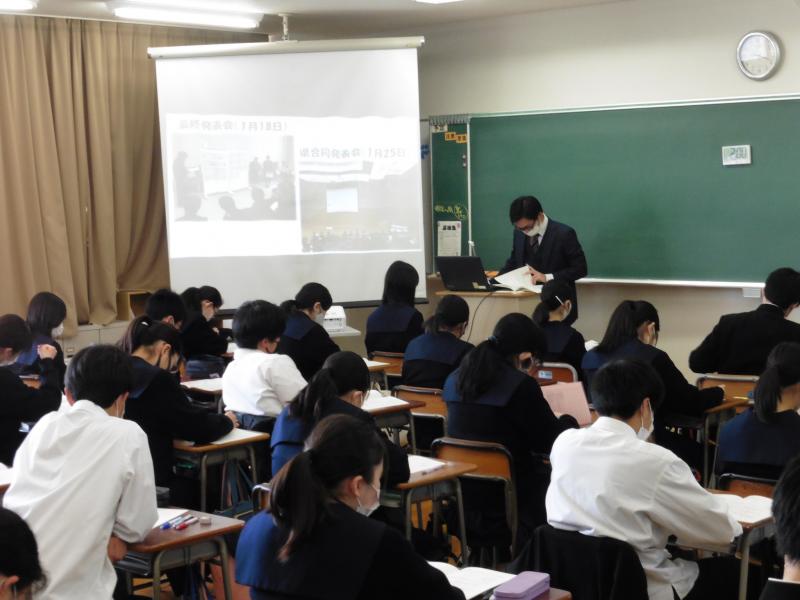 指導助言者の石川県教育委員会 大鍛治指導主事 をはじめ、多くの先生方や普通科文系の生徒、