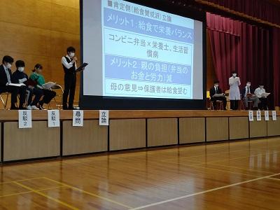 「高校でも給食を導入すべきである」という論題で、担任の先生による「モデルディベート」が行われました。