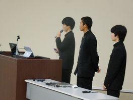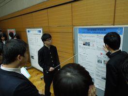 SSH指定3校による口頭発表が行われ、本校からは、11月の校内選考会で選ばれた理数科2年生の課題研究2グループ「海岸線とフラクタル」と「液面で浮上する液滴の安定性について」が代表として発表を行いました。その後、NSH指定校2校を含めた5校のすべての課題研究のポスター発表が行われました。ここで、理数科2年生の生徒達は、他校の生徒達や先生方とのポスターセッションを行うことで、今後の研究の参考にすることができました。また、参観者として参加した本校理数科1年生は来年度に取り組む課題研究の参考になるよう、熱心に質問をしていました。