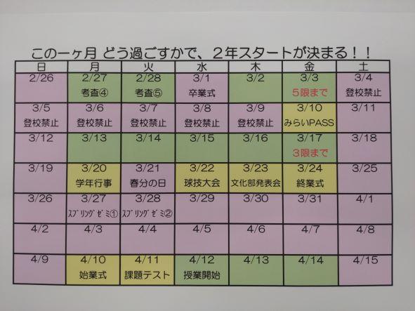 最初に学年主任より、外部模試の結果を受けての学年の課題および生徒一人ひとりに期待する想いが語られました。話の中で提示された1か月のカレンダー(上記のもの)には、どよめきの声が上がっていました。
