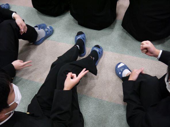 前半は各教室で練習をし、後半は1階に降りて、廊下を使って行いました。