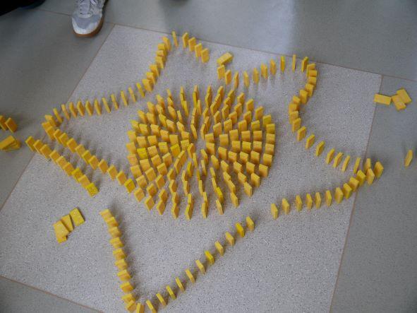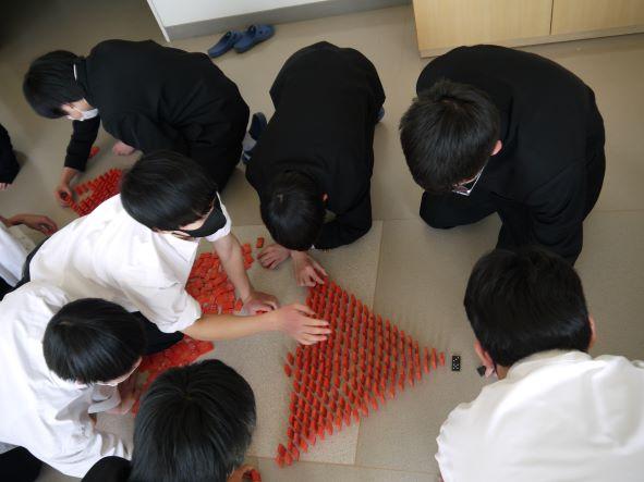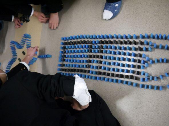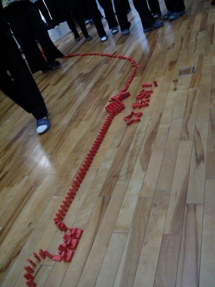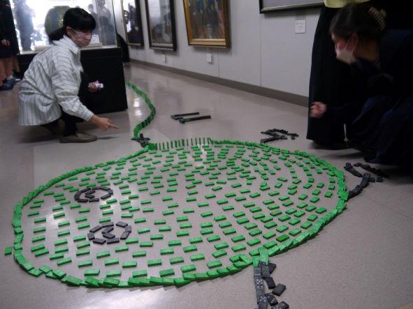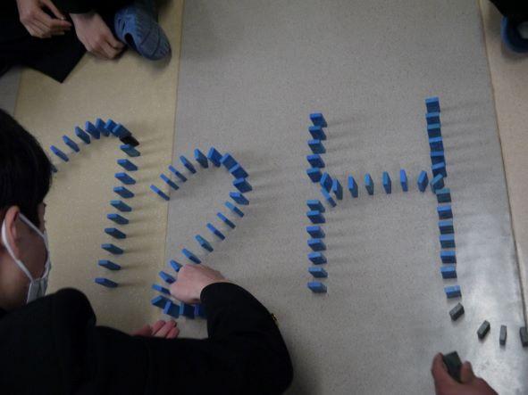 10000個のドミノピースを1年生全員でつなげようと頑張りました。