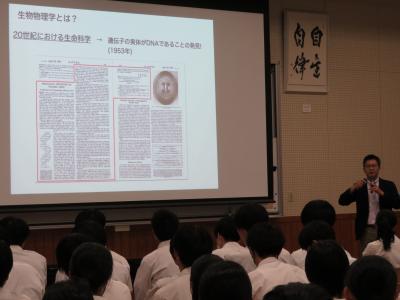 9月26日(火)、名古屋大学から内橋貴之教授をお招きし、「見て触って理解するタンパク質の働き―分子生物学の最前線―」と題して、3年生普通科理系、理数科の生徒を対象に特別講義を行っていただきました。