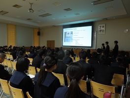 「課題探究Ⅱ」では、自分たちが設定した課題について1年間研究を行います。開講式では、校⾧先生から激励の言葉をいただき、担当の先生方との対面式を行いました。また、みんな真剣に課題研究を行う上での諸注意を聞いていました。
