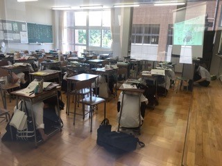 生徒は放送の指示に従い「しゃがむ」「隠れる」「じっとする」といった安全行動をとりました