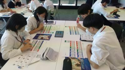 企業・広告コースは、午前は野村総合研究所を訪問し、サステナビリティ推進部の伊東様によるDX戦略体験プログラムを体験しました。コンビニ経営のゲームを通してコンサルティングやSEの仕事や必要な力について楽しく学ぶことができました。午後はアドミュージアム東京を訪問し、国内外の広告について学ぶことができました。
