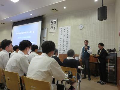 10月31日(木)6・7限、1年生の地理総合・歴史総合・英語による領域融合型授業の一環として、駐日EU代表部による出前授業「2024年「EUがあなたの学校にやってくる」」が開催されました。講師として、ラトビア大使館特命全権大使であるズィグマールス・ズィルガルヴィス氏をお招きし、EUやラトビアについてお話をしていただきました。生徒からも活発にEUやラトビアに関する質問が飛び交い、とても学びの多い時間となりました。