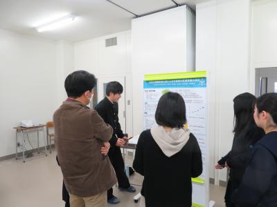 この発表会には、年間を通してアドバイスをくださった「こまつ研究サポートプログラム」メンバーの先生方や、大学院生・大学生をお招きしました。みなさん各ポスターの前で、じっくりと発表を聞き、時間をかけて丁寧に様々な観点から専門的な助言をしてくださいました。生徒からは「的確なアドバイスをいただき、今後どのように結果をまとめるかの方向性をはっきりさせることができた」「初めて発表を聞く人に伝わるようにするには、前提条件などを丁寧に説明する必要があると実感した」という声が聞かれました。