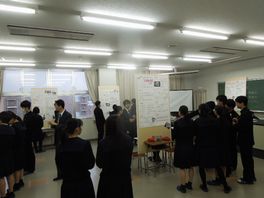 どの班も同じ実験の方法(中和滴定)でしたが、わかりやすいポスター作成や説明の仕方など、班によっていろいろ工夫している様子が見られ、とても興味深く視聴することができました。発表者も視聴者も熱心にポスターセッションしていました。来年度、2年生で行う課題研究がとても楽しみです。