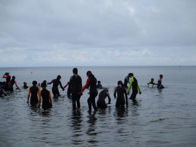 初日の午前中は、ウェットスーツを着て海に入り、海洋生物採取です。はじめはおっかなびっくりでしたが、徐々にコツを掴み、しっかり潜って大量のムラサキウニを採ることができました。その他にもウミウシやナマコ、ヒトデなど、様々な生物を発見。後程じっくり観察します。