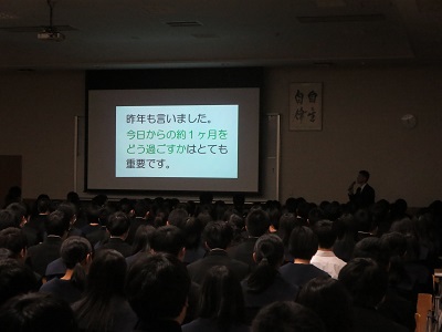 2年生ミニ学年集会を行いました 投稿日時 : 2019/02/28 mtak カテゴリ:2年 本日、学年末考査が終わりました。考査中は多くの生徒が放課後学校に残り、勉強する姿が見られました。卒業式準備の合間を利用して、学年集会を行いました。学年主任の先生からは、今日から1か月余りの期間がとても重要であることを、スライド資料をもとにお話がありました。考査の疲れも吹き飛んで、生徒は真剣に聞いていたようでした。明日は卒業式 3年生の皆さん、ご卒業おめでとうございます。