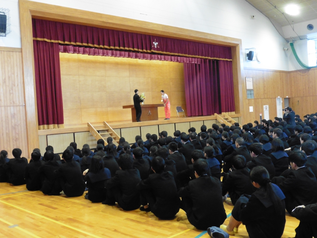 全校生徒の前で、何度も失敗しながらも優勝できた苦労話をされ、東京オリンピックでも「金メダル」以上の成績を収めたいと力強く語っていただきました。また、「挑戦」と書いた色紙をいただきました。