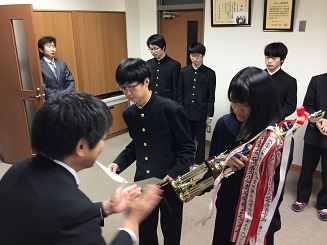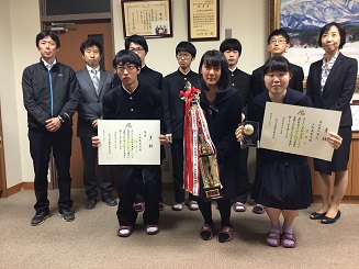 10月19日(日)に、地場産業振興センターで行われた「いしかわ高校科学グランプリ」ですが、本校のチーム「001」が総合優勝を果たし、本日本校にて表彰式がありました。