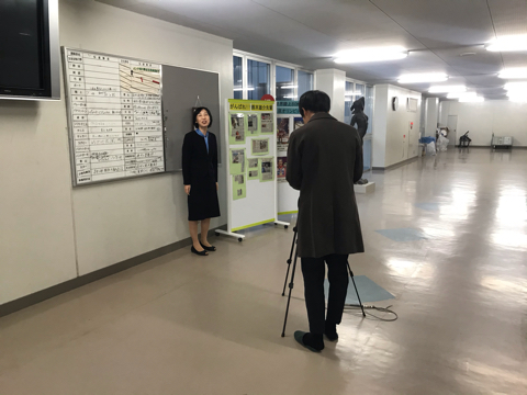 校舎にかかっている懸垂幕や同窓会記念館内の応援展示等の撮影に続いて、生徒玄関にある応援展示と鈴木選手が後輩に向けて”挑戦”と記した色紙をバックに中川校長がインタビューを受けました。来年8月がますます楽しみになってきました。