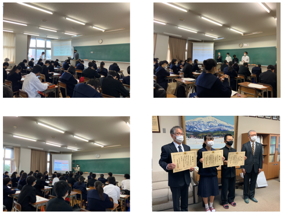 また,同日には小松税務署より,令和3年度「税に関する高校生の作文」で表彰された本校生徒2名に対し,賞状の授与が行われました。   金沢国税局長賞 17H 奥村 奏太  小松税務署長賞 11H 中野 桜子