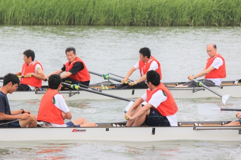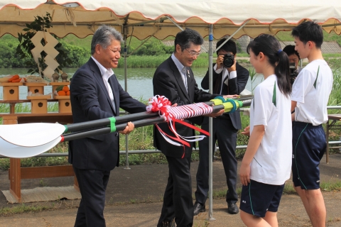 今年は120周年記念事業の一環として、同窓会からナックルフォア3艇が寄贈されました。今日はそのお披露目となり、はじめに安全祈願祭と贈呈式を執り行ってから、一昨年本校OBの江口さんより寄贈された3艇とあわせてピカピカの6艇で、レースが行われました。
