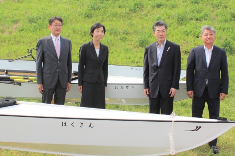 真新しいオールに紅白のリボンを 新艇は、校歌の歌詞から「はくさん」