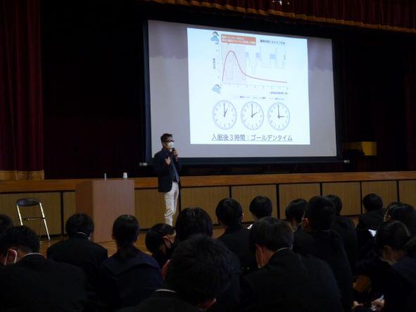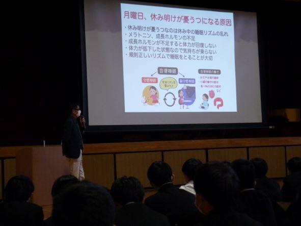 校是である文武両道に励む彼らに、学校医である 惠仁クリニック 村井裕先生から、睡眠の大切さ、ストレスが心身に及ぼす影響などのお話と、生徒一人ひとりが自らの健康管理について日頃から意識するよう働きかけがありました。