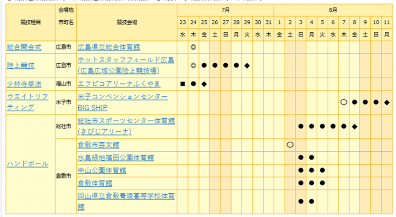 ○ 競技種目別開会式 ■ 競技種目別開会式後競技 ●= 競技 ◆ 競技後閉会式 □ 閉会式
