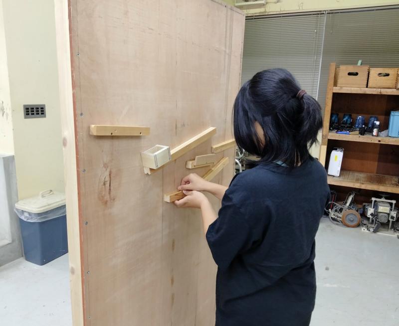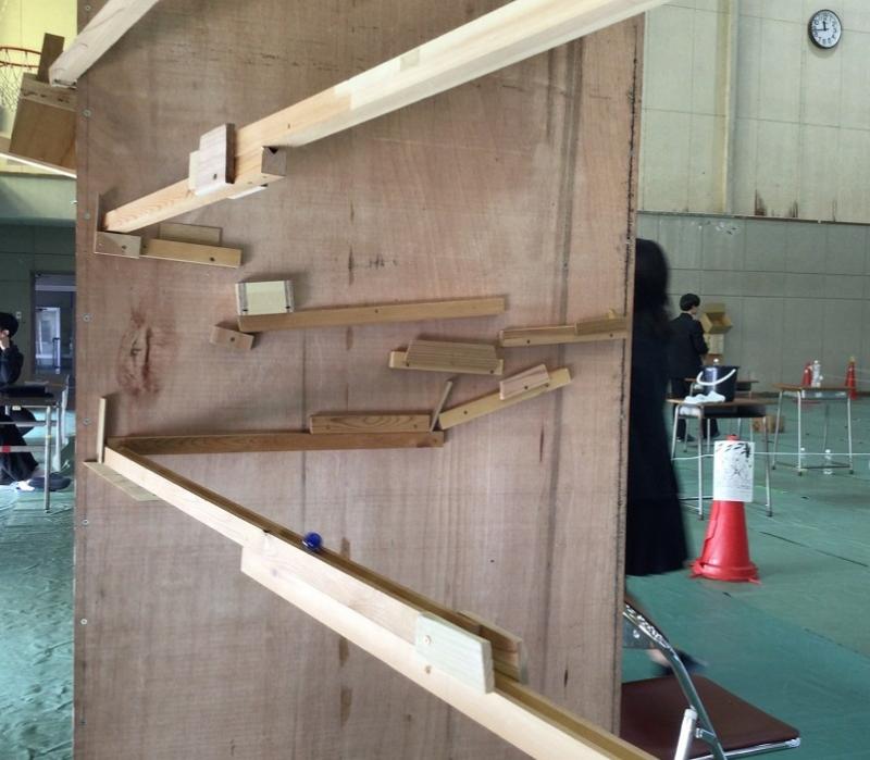 今回は製作時間が短く、2枚の大きな板と様々な長さのレールを組み合わせた一見シンプルな作りの装置になりましたが、よく見ると仕掛けやこだわりがあり、来場者にビー玉を転がせて楽しんでもらい、それぞれの仕掛けについて説明をしました。