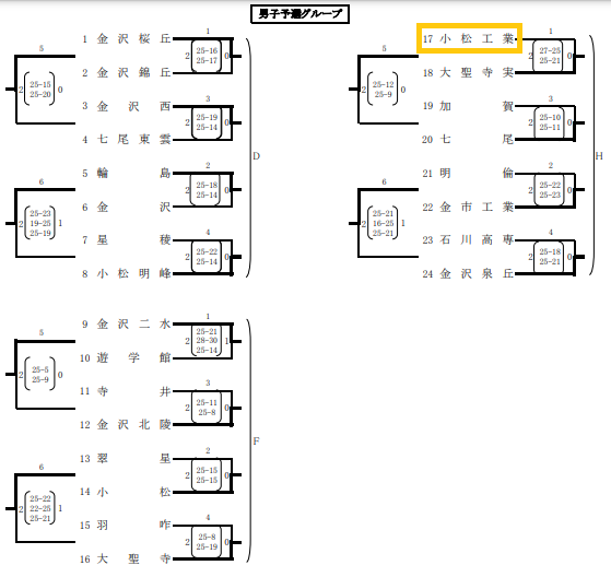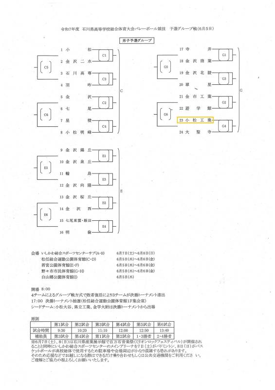 令和7年度 石川県高等学校総合体育大会バレーボール競技の予選グループ戦の組み合わせです。