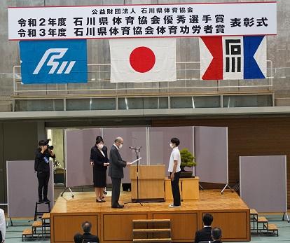 9月23日、いしかわ総合スポーツセンターにて表記の表彰式が行われ、令和3年度3月(令和2年度)に全国選抜大会を制した本校、少林寺拳法部が石川県体育協会優秀選手賞を受賞しました。受賞者代表として日光 駿太選手が受賞式に出席しました。