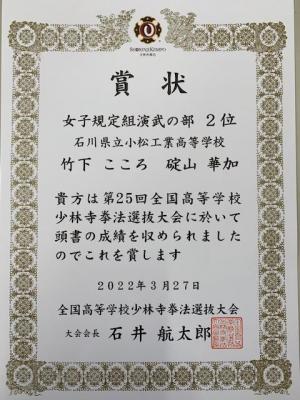 また、女子規定組演武の部においては、竹下こころ・碇山華加 組が第2位となりました。