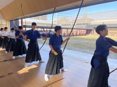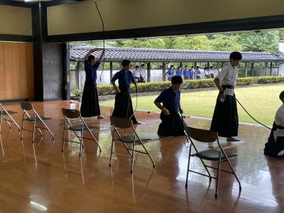 午前中は個人戦と団体予選。個人戦では、予選を通過した本校女子1、男子3が射詰形式の決勝に。