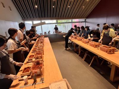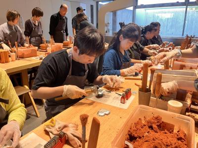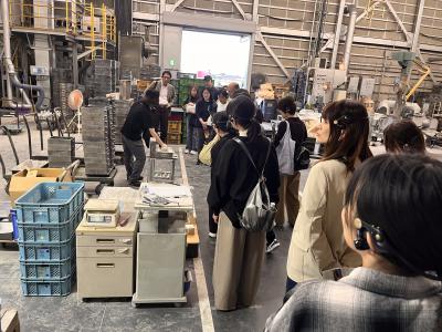 今回の研修では、実際に販売も行っている食器で提供される昼食をいただいた後、鋳造体験、工場見学を行いました。