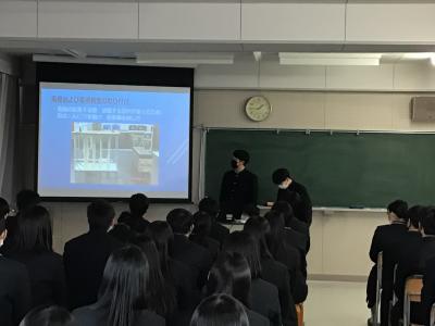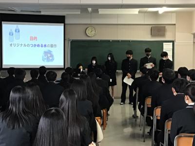 材料化学科3年生が8グループに分かれ、自分たちで探し出した課題を1年間かけて探究しました。1月26日、1,2年生に発表しました。