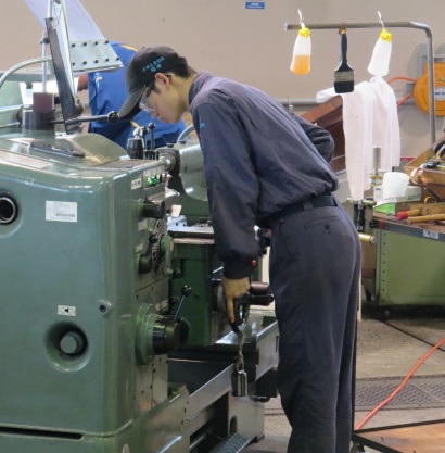 旋盤作業部門では旋盤という工作機械を使用し、炭素鋼の円柱を指定の寸法に削り出したり、ねじを切ったりして、その精度・ねじのはめ合い等を競います。
