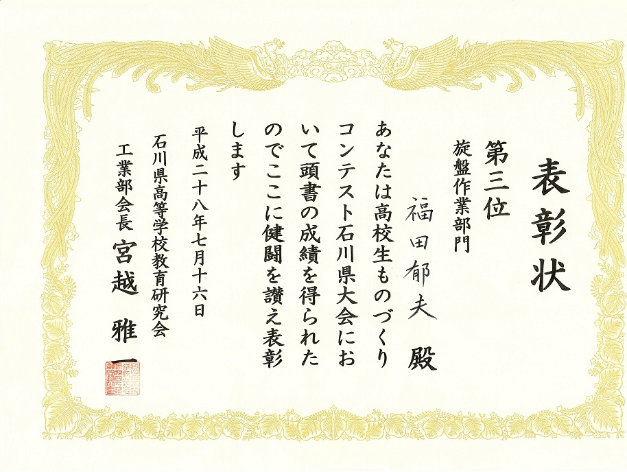 高校生ものづくりコンテスト旋盤作業部門 石川県大会優勝!