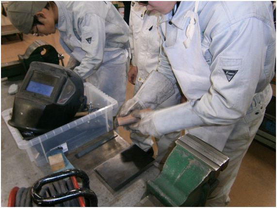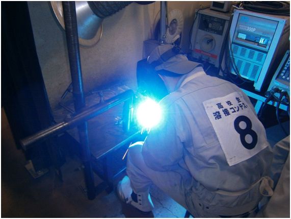 半自動溶接機で厚板9mmを1時間以内、薄板厚さ3.2mmを30分以内に溶接し、審査員による採点を行い、順位を決めます。