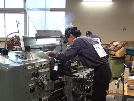 旋盤作業部門では旋盤という工作機械を使用し、炭素鋼の円柱を指定の寸法に削り出したり、ねじを切ったりして、その精度・ねじのはめ合い等を競います。
