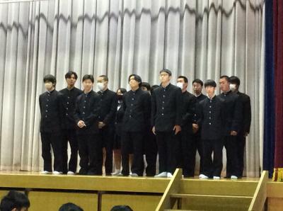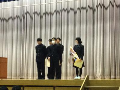 2学期こま工競技大会において、各競技1位の皆さんの健闘を称える表彰式が行われました。