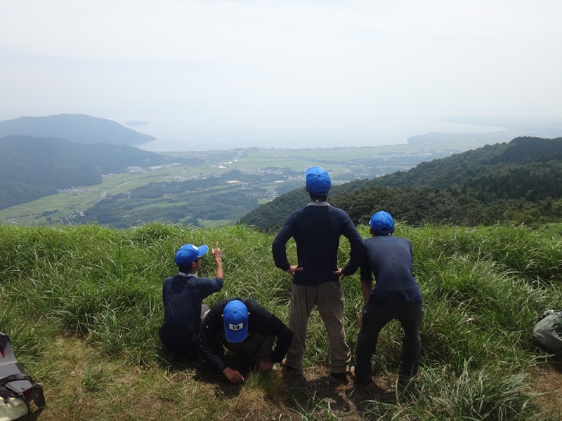 大谷山山頂、琵琶湖をバックに写真撮影。ちょっとだけ幕営地も見えます。