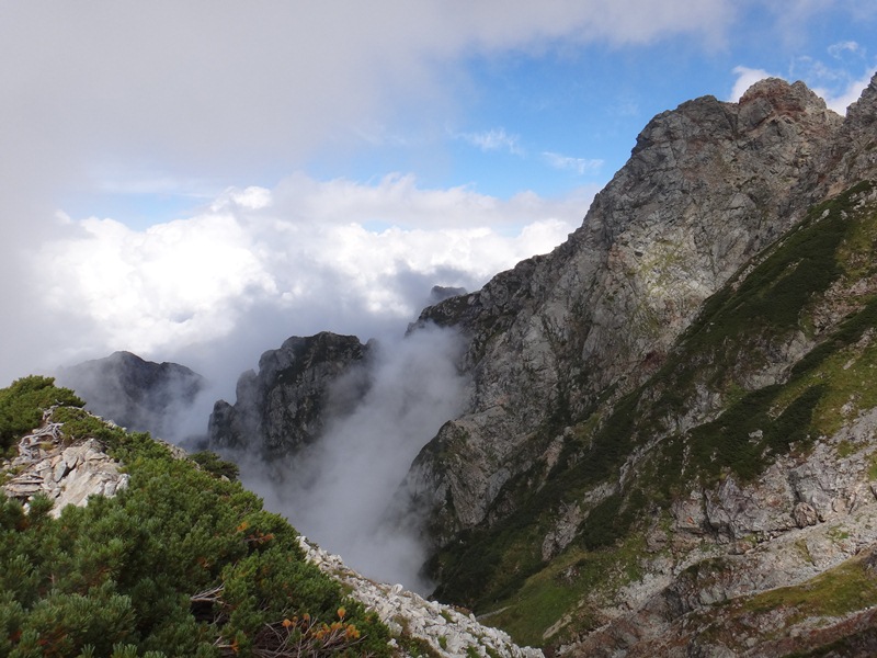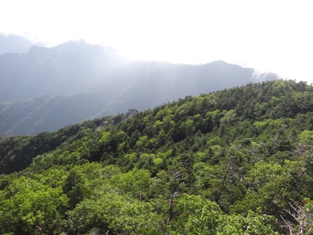 下山の景色です。「よくあんなとこ登ったな」と口ずさみながら自分たちの立っていた山頂を見上げています。