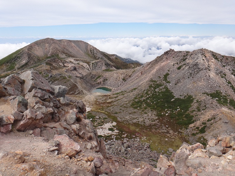 白山山頂、御前ヶ峰から写した景色です。真ん中に見える池は紺屋ヶ池、右側の山は剣ヶ峰です。